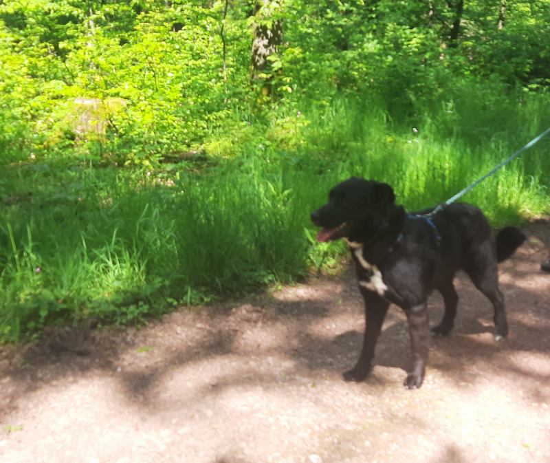Unsere kleine zarte Fee (rechts) genießt den Waldspaziergang mit ihrem neuen Hundekumpel