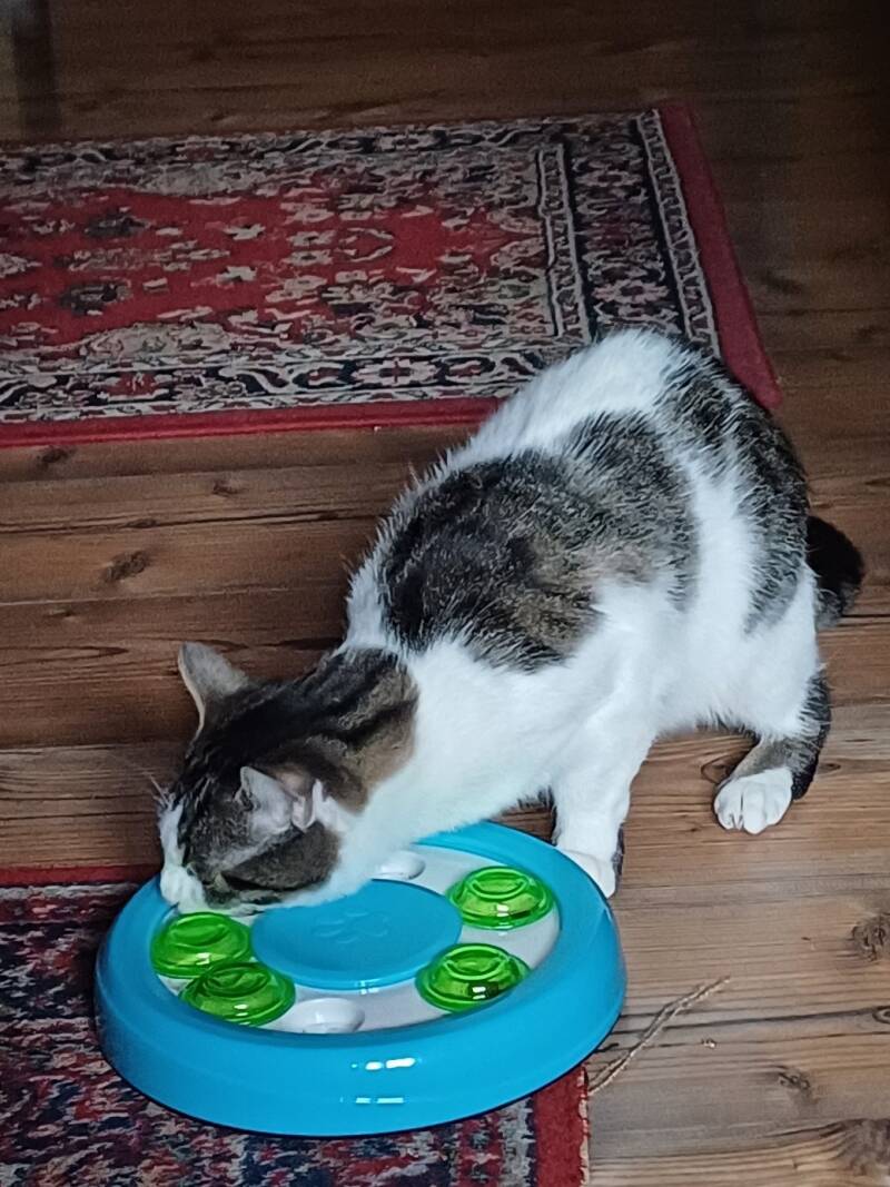 Kater George hat sich in seinem neuen Zuhause gut eingelebt und zeigt dies durch guten Appetit und ausgiebiges Schmusen